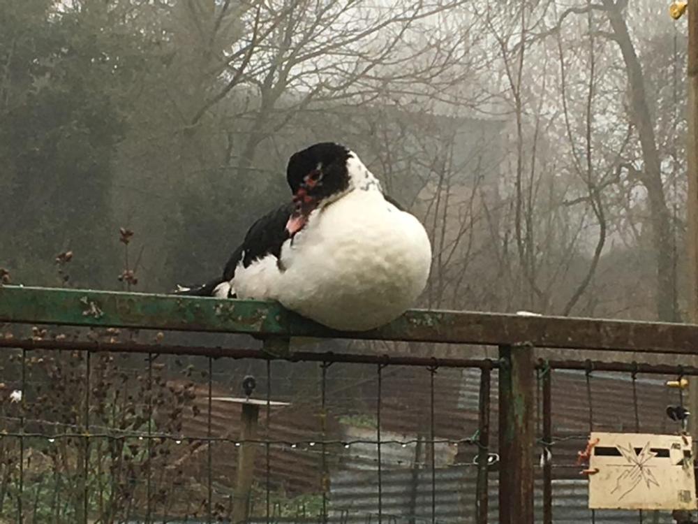 A fat duck sits on the fence